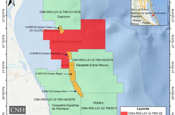 La Comisión Nacional de Hidrocarburos (CNH) aprobó el plan de exploración presentado por la empresa Deutsche Erdoel México para el contrato CNH-R03-L01-G-TMV-02/2018, en el cual realizaría inversiones de entre 10.86 y 13.14 millones de dólares.