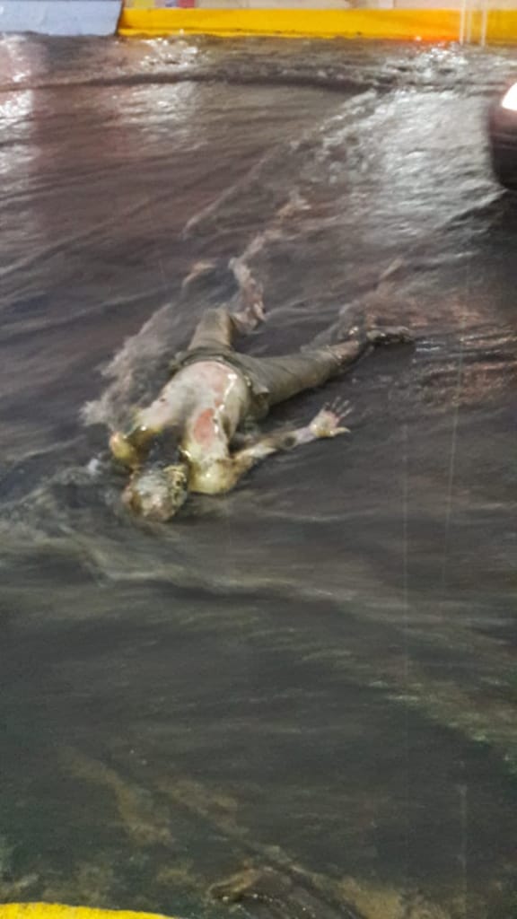 La noche de este viernes el cuerpo en avanzado estado de putrefacción de una persona, al parecer del sexo masculino, apareció en pleno centro de la ciudad de Catemaco, luego que la fuerte corriente lo arrastrara hacía la calle Carranza a unos cuantos metros del palacio municipal.