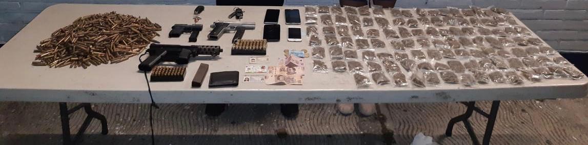 Se les encontró tres armas de fuego, 997 cartuchos, 110 bolsas de marihuana, cuatro celulares, dinero en efectivo y se les aseguró un vehículo.