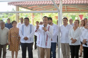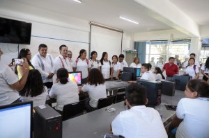 Posteriormente, cortó el listón inaugural del Laboratorio de Idiomas que dará servicio a 677 jóvenes del Centro de Estudios de Bachillerato 5/13 «Ángel Saquí del Ángel», de la colonia La Mata, donde invitó a los alumnos a aprovechar las nuevas instalaciones y continuar hacia la educación superior.