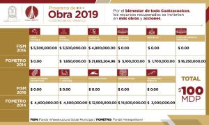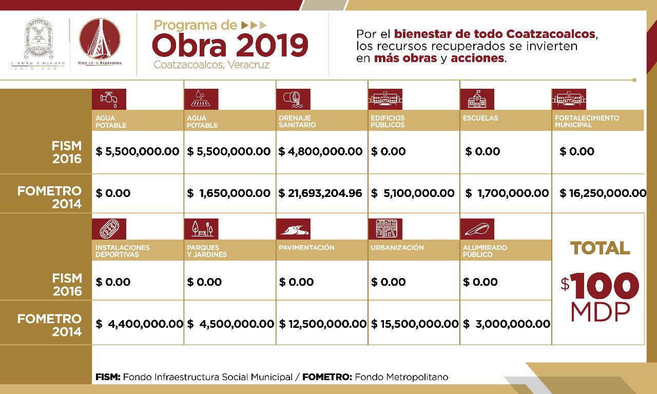 Los integrantes del Cabildo de Coatzacoalcos autorizaron la utilización de recursos recuperados del Fondo Metropolitano Coatzacoalcos (FOMETROC) 2014, para la realización de obras de Agua Potable, Drenaje Pluvial, Drenaje Pluvial, Drenaje Sanitario, Edificios Públicos, Escuelas, Fortalecimiento Municipal, Instalaciones Deportivas, Parques y Jardines, Pavimentaciones, Urbanización y Alumbrado Público.