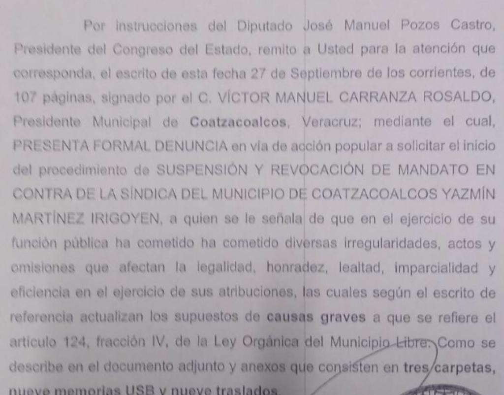 El pasado 27 de septiembre el presidente municipal de Coatzacoalcos, Victor Manuel Carranza Rosaldo presentó formal denuncia en vía de acción popular a solicitar el inicio del procedimiento de suspensión y revocación del mandato en contra de la sindica Jazmín Martínez.