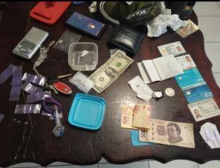 Asimismo, oficiales intervinieron a Dagoberto «N», a quien le decomisaron un recipiente que contenía droga conocida como cristal, una báscula gramera, dinero en efectivo, una pipa, un teléfono móvil y tarjetas bancarias.
