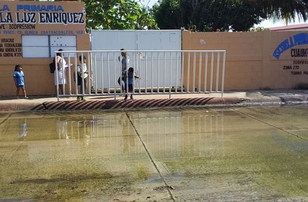 Los padres de familia de Ciudad Olmeca se encuentran muy irritados ante la omisión e incapacidad de la Comisión Estatal del Agua de Veracruz oficina Coatzacoalcos que no puede resolver esta fuga de aguas negras frente a una escuela primaria.