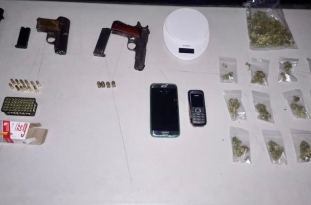 Durante la inspección decomisaron 16 bolsitas con marihuana, una pistola calibre .22, otra calibre .380, marca LLAMA, y una más de calibre .32 (todas con cargador abastecido), así como dos celulares, una báscula digital, 57 cartuchos calibre .22 y dos armas punzocortantes.