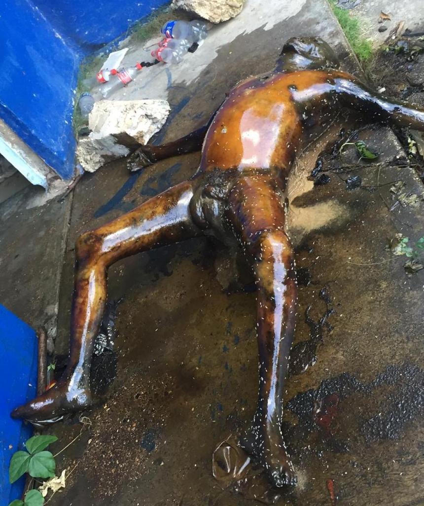 Cerca del mediodía que autoridades policíacos fueron alertadas de la presencia de este cadáver que se encontraba a un costado del salón de talleres mecánicos.