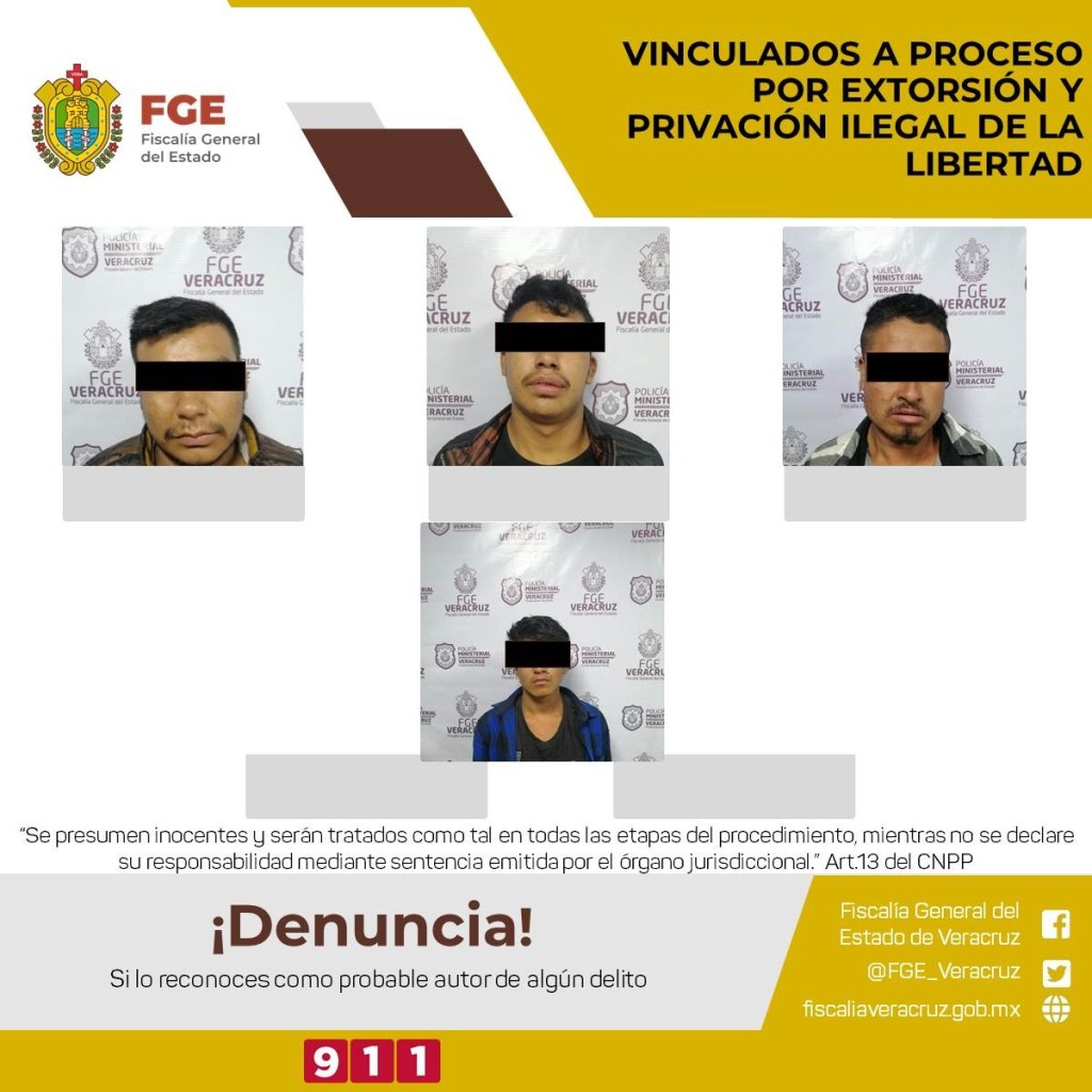 La Fiscalía de Distrito con sede en Orizaba, obtuvo cuatro vinculaciones a proceso en contra del mismo número de personas por su probable responsabilidad en la comisión del delito de privación ilegal de la libertad y extorsión en agravio de dos personas.
