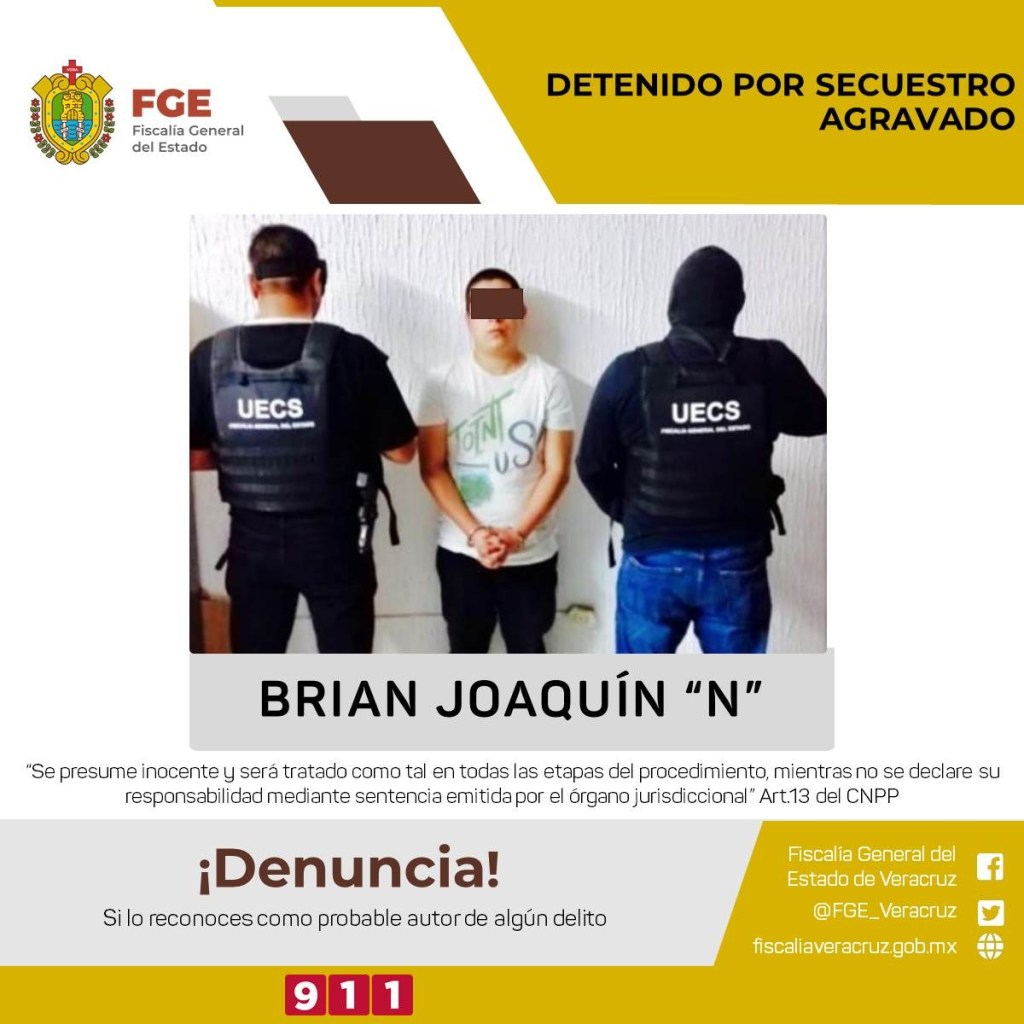 Mediante el despliegue de un operativo de inteligencia e investigación, los agentes especializados detuvieron a Brian Joaquín “N”, como presunto responsable del delito tipificado por la Ley como secuestro agravado, cometido en agravio de una víctima de ocupación taxista, hechos ocurridos en le ciudad de Nogales en el referido mes.