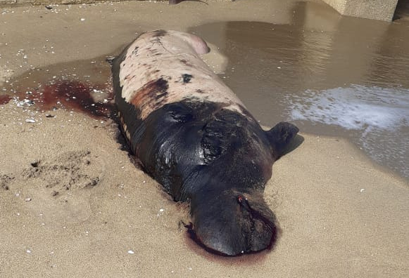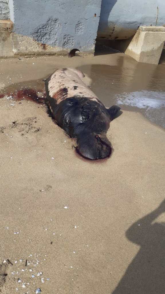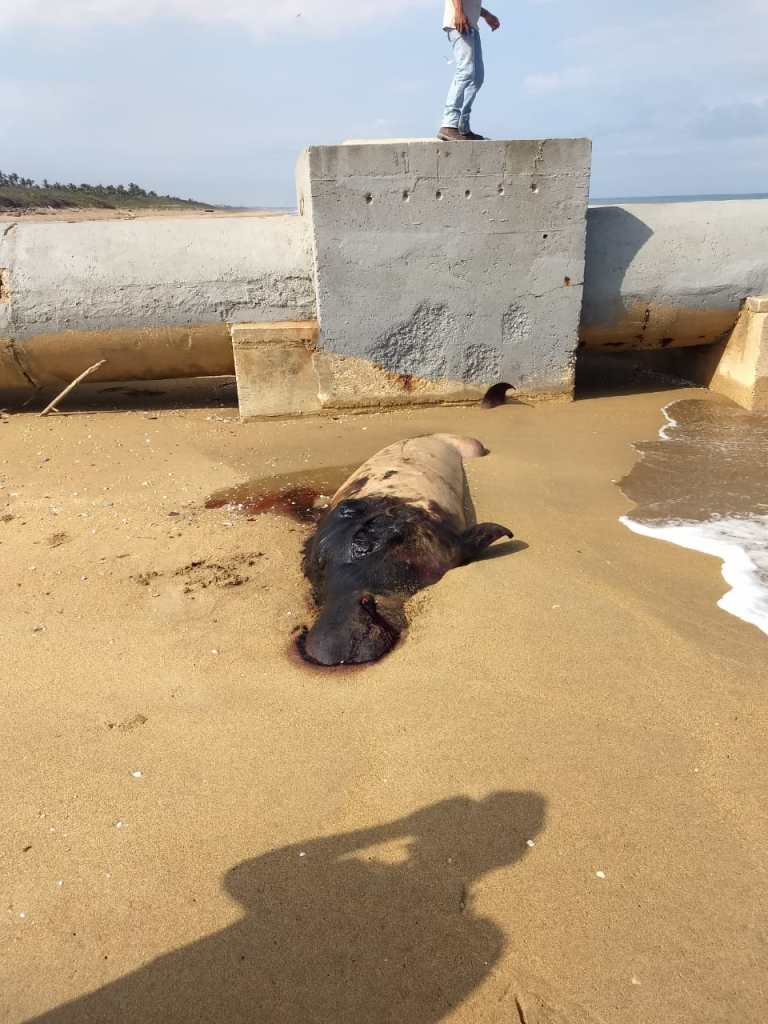 Un ejemplar de delfín hallado sin vida y en estado de putrefacción fue localizado cerca de tuberías industriales localizadas en playas de Coatzacoalcos en la Congregación de Colorado.