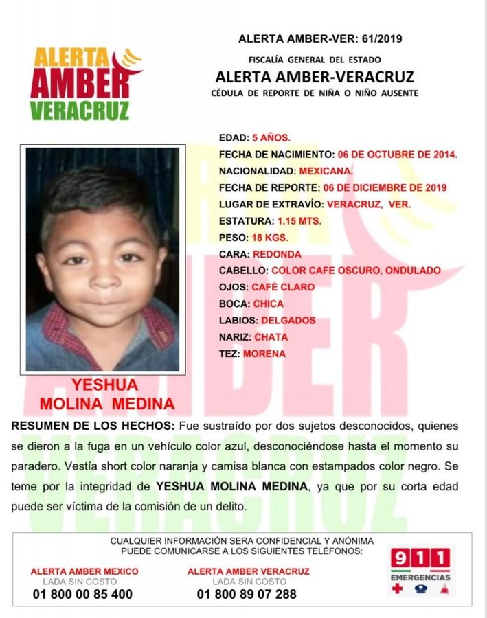 La Fiscalía General del Estado de Veracruz activó la Alerta Amber para localizar al menor Yeshua Molina Medina, quien fue raptado el este viernes en Veracruz.