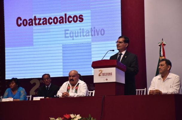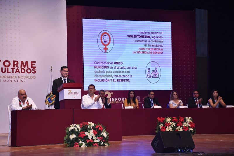 El Presidente Municipal de Coatzacoalcos, durante su 2° Informe de Gobierno en el Teatro de la Ciudad, anunció los proyectos que su administración tiene para el próximo año en materia de saneamiento, seguridad, infraestructura, así como la compra de cuatro nuevas unidades para la recolección de basura y alcanzar un 95 por ciento de eficiencia en este servicio.
