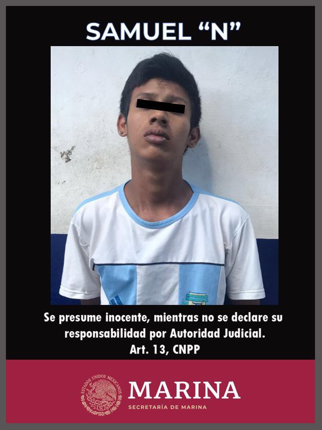 Al ver la situación, el personal naval inició persecución, logrando la detención en flagrancia de dos de los presuntos asaltantes, que respondieron a los nombres de Luis Mario N y Samuel N, a quienes les fue localizado entre sus pertenencias 25 dosis de presunta droga con las características propias del estupefaciente conocido como piedra y dos armas blancas (cuchillos).