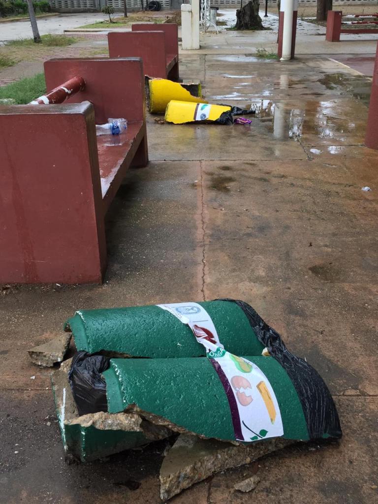 Durante esta madrugada, el departamento d eLimpia Pública del Municipio de Coatzacoalcos fue blanco de vandalismo luego que delincuentes destruyeron todos los contenedores de basura en el parque Maza de Juárez.