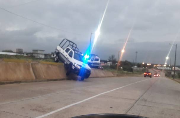 La patrulla quedó colgada, atrapa en el desnivel de la vialidad.