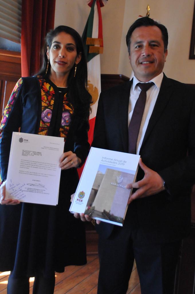 Más tarde, con la finalidad de dar a conocer las acciones de la Fiscalía y realizar un ejercicio de transparencia y rendición de cuentas, Verónica Hernández Giadáns, visitó al Gobernador Cuitláhuac García Jiménez, para hacerle entrega de un ejemplar del «Informe Anual de Actividades de la FGE 2019», pues parte de las acciones descritas en este documento, son el resultado de los trabajos de las Mesas para la Construcción de la Paz, así como de las actividades conjuntas con las instituciones encargadas de seguridad.