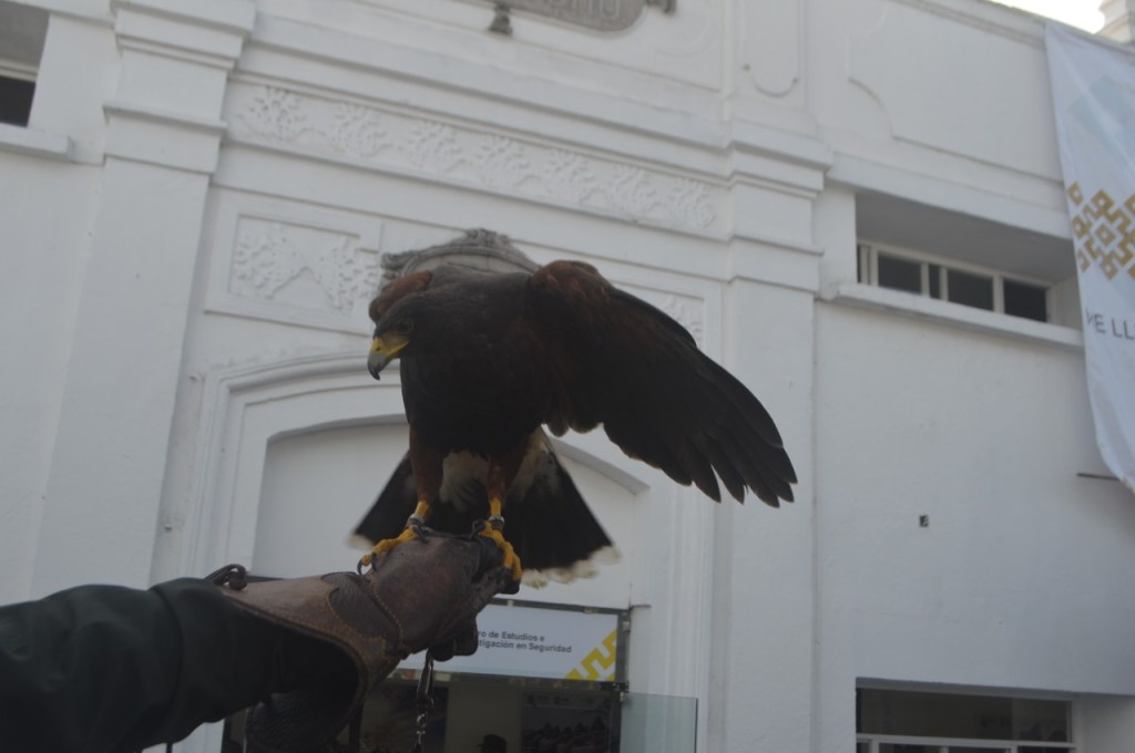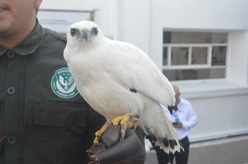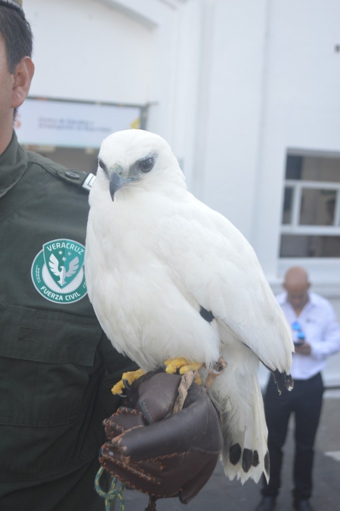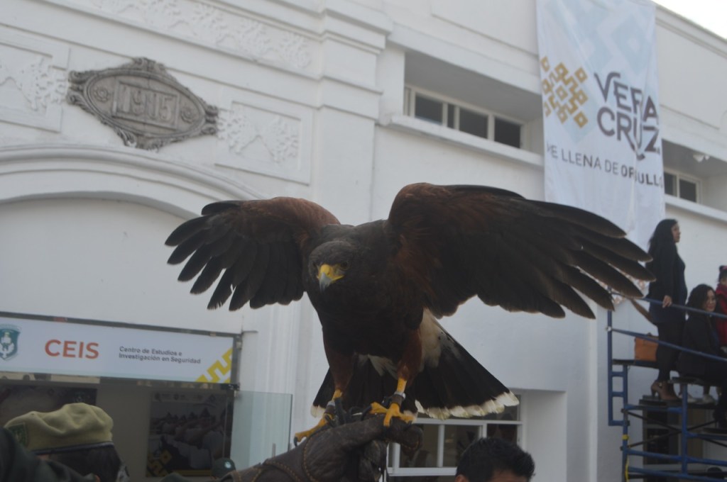 En la demostración de vuelo que hicieron este viernes ante el Gobernador de Veracruz, Cuitláhuac García; y el Secretario de Seguridad Pública, Hugo Gutiérrez Maldonado, esta ave rapaz voló sobre la explanada del CEIS para regresar al puño de su entrenador.
