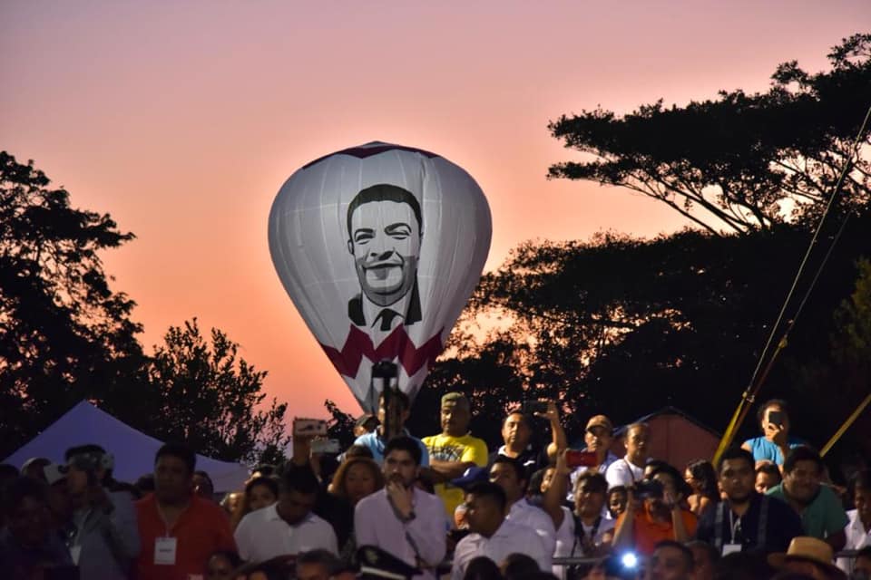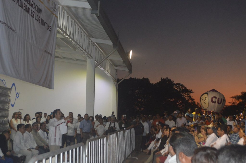 Durante la inauguración de la planta modernizada y rehabilitada de agua mineral Coyame en el municipio de Catemaco, artesanos de San Andrés Tuxtla le dedicaron un par de globos monumentales de papel china en honor a los políticos veracruzanos.