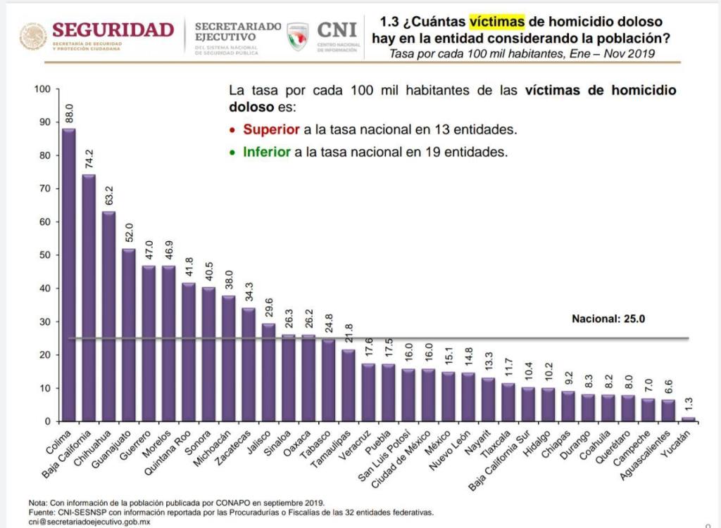 Al cierre de este año y de acuerdo con el Secretariado Ejecutivo del Sistema Nacional de Seguridad Pública (SESNSP), con corte al 30 de noviembre, Veracruz se ubica por debajo de la media nacional en cuanto a homicidios dolosos, registrando 17.6 por ciento.