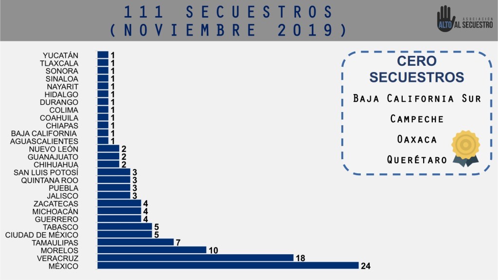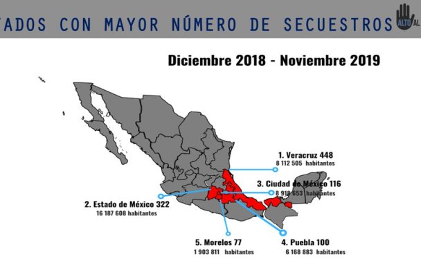 La activista señaló que las entidades federativas con mayor incidencia de secuestro son Veracruz, con 448 casos al momento; Estado de México, con 322; Ciudad de México, con 116; Puebla, con 100, y Morelos, con 77.