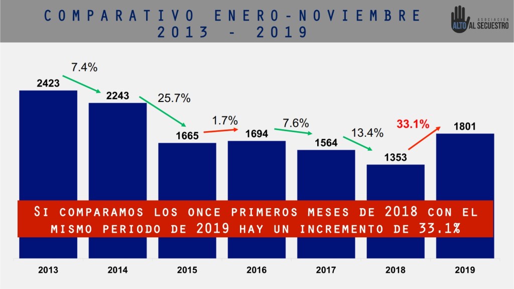 Aunque las víctimas de secuestro en el país disminuyeron 23.7% en noviembre pasado, 2019 cerrará como el año con mayor incidencia en este delito de alto impacto, de acuerdo con la organización Alto al Secuestro.