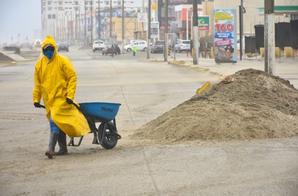 El Gobierno Municipal, a través de la Secretaría de Obras Públicas y Desarrollo Urbano, mantiene plan emergente para retirar la arena que arrastran los fuertes vientos del norte del Frente Frío número 23, en el Malecón Costero.