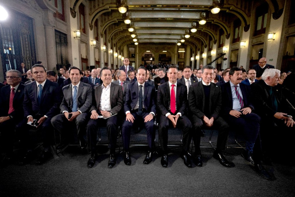 Con la presencia del gobernador de Veracruz, Cuitláhuac García Jiménez, y sus homólogos de Michoacán, Yucatán, Querétaro, Oaxaca, Chiapas, Chihuahua, Zacatecas, San Luis Potosí, Tlaxcala, Quintana Roo, Durango y Colima, el mandatario federal reiteró los cuatro principios para una atención universal y gratuita: mejorar la infraestructura, que haya médicos suficientes, garantizar medicamentos y basificar a 87 mil trabajadores del sector.