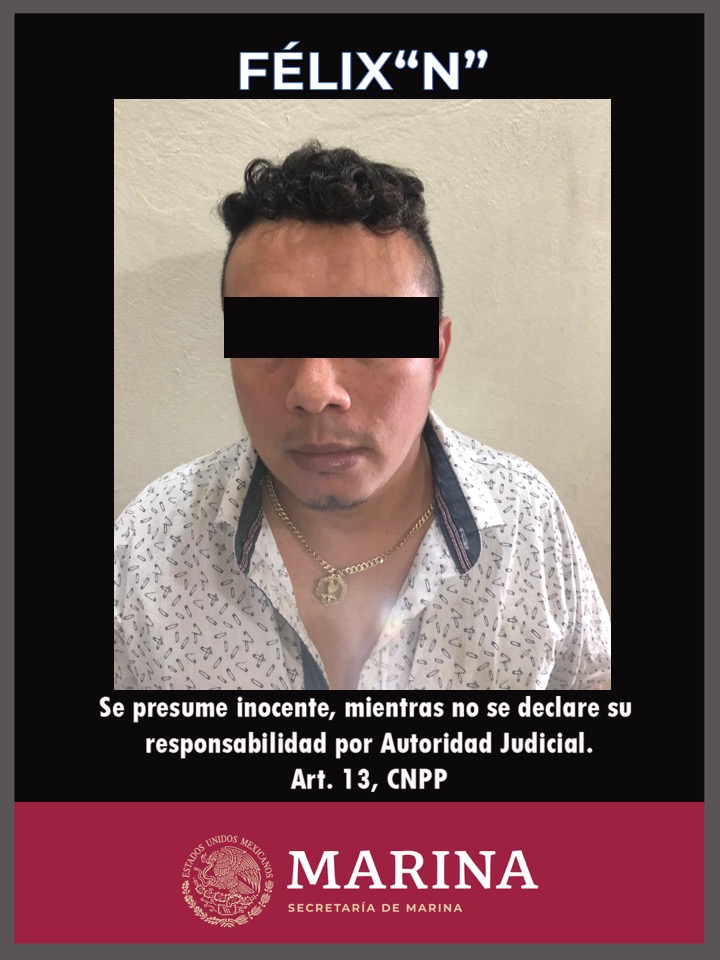La Secretaría de Marina-Armada de México, en funciones de Policía Naval en acciones de apoyo a la seguridad pública a través de la Tercera Zona Naval, informa que el día de ayer durante patrullaje de reconocimiento, personal perteneciente a la Primera Brigada de Infantería de Marina en coordinación con elementos de la Policía Naval, detuvieron en la colonia Puerto Esmeralda a Félix “N” presunto infractor de la Ley.