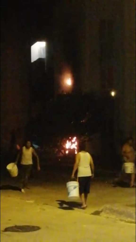 Durante esta noche del sábado, se registró un fuerte incendio en un conjunto de departamentos en el Fraccionamiento Villas San Martín. Lo vecinos pretendían apagar el fuego mediante cubetazos de agua.
