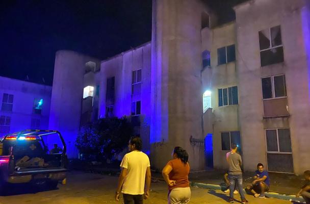 Durante esta noche del sábado, se registró un fuerte incendio en un conjunto de departamentos en el Fraccionamiento Villas San Martín. Lo vecinos pretendían apagar el fuego mediante cubetazos de agua.