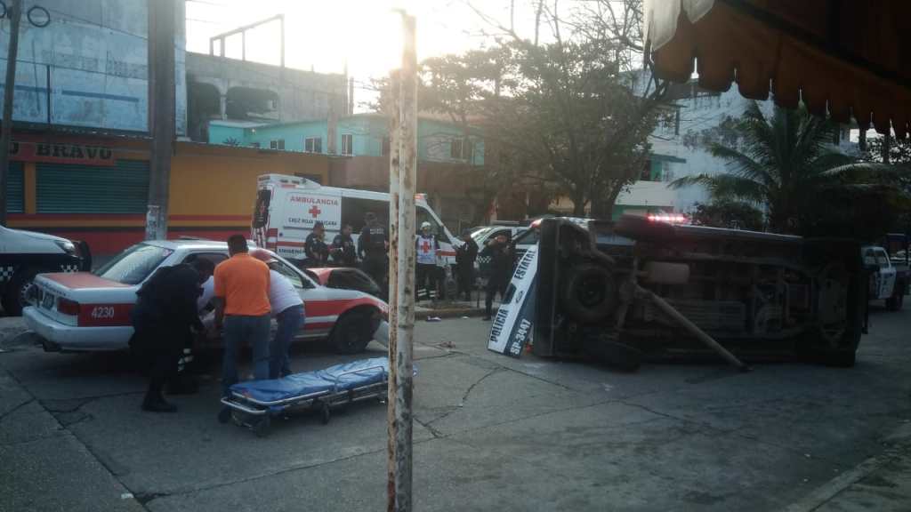 El oficial conductor de la patrulla quiso evitar el golpe por la intrusión del taxista pero no se pudo: terminó volcado con todo y camioneta con policías tras el fuerte choque.