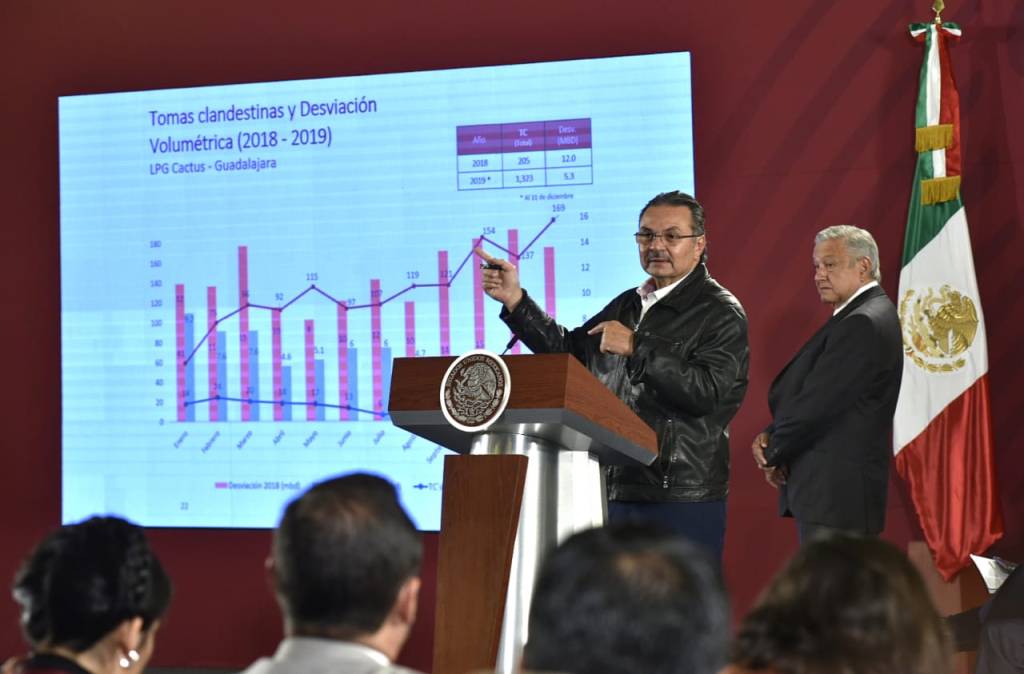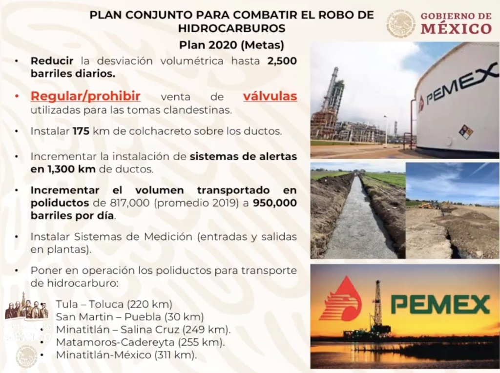 El titular de Pemex informó que actualmente el robo de combustible es de 5 mil barriles diarios, equivalentes a 15 millones de pesos y el plan establece como meta para este 2020 reducir esta cifra a 2 mil 500, así como prohibir la venta de válvulas utilizadas para las tomas clandestinas y colocar colchacreto a lo largo de 175 kilómetros sobre los ductos.