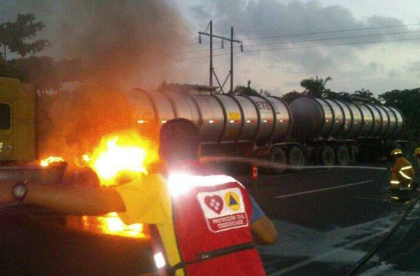 El auto-tanque de doble remolque estaba cargado de turbosina; afortunadamente el incendio fue controlado.