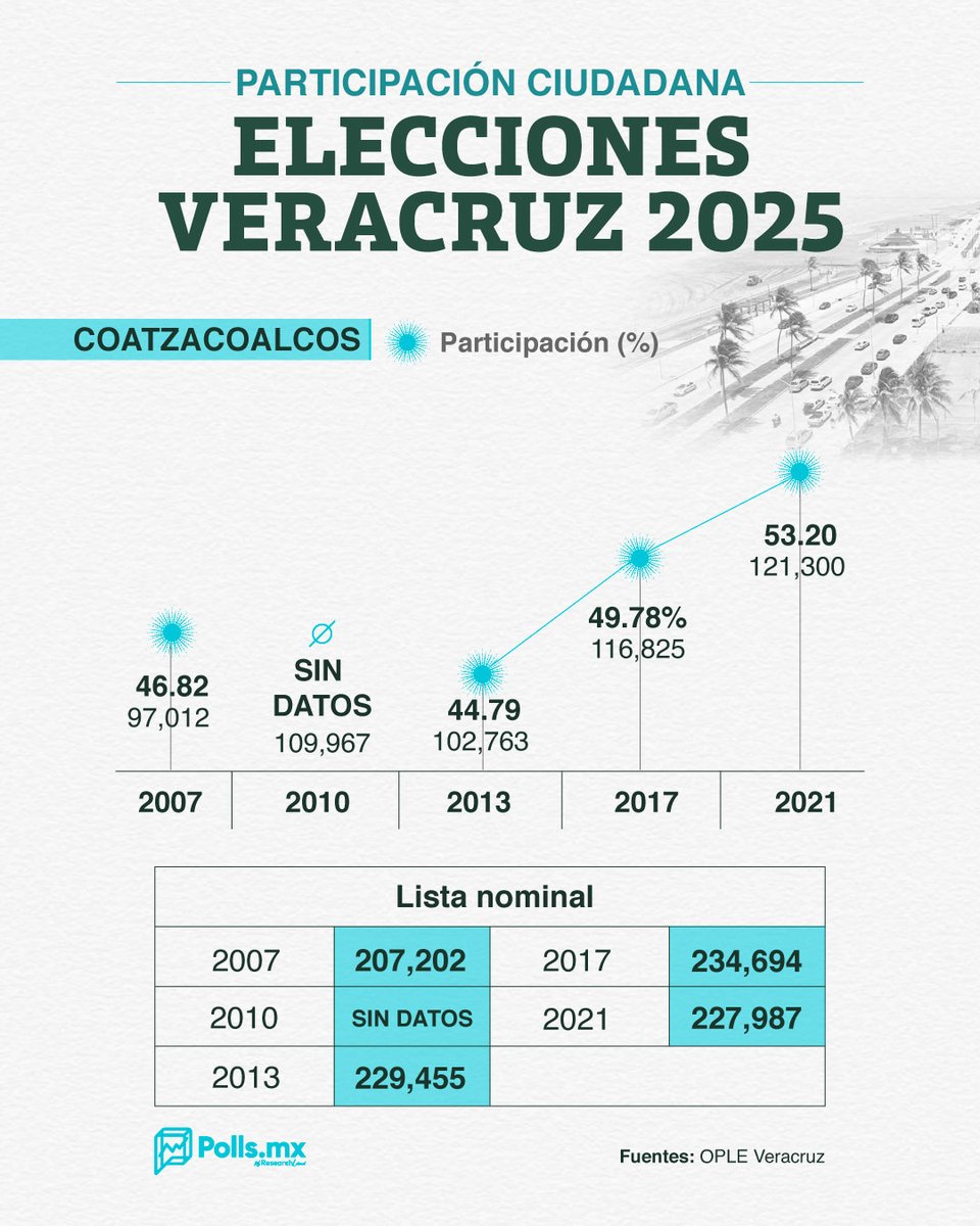 En conclusión, durante las últimas tres elecciones el porcentaje de personas que han acudido a las urnas en #Coatzacoalcos, Veracruz ha crecido paulatinamente.