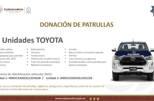 El presidente municipal, Amado Cruz Malpica, anunció en rueda de prensa la donación de dos patrullas por parte de la Terminal Química Puerto México, que reforzarán la seguridad en Coatzacoalcos.