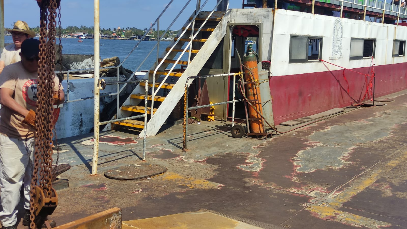Dentro del transbordador “Laguna de Coapa” se puede ver una cinta de precaución y tanques de soldadura en el área donde usualmente suben los vehículos.