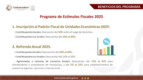Los descuentos son del 50 por ciento para locales y 40 por ciento para no locales en la inscripción al Padrón Fiscal de Unidades Económicas 2025, 40 y 30 por ciento en el refrendo anual, así como la condonación al 100 por ciento en multas y en el caso de suspensión de actividades se deberá únicamente cubrir el 25 por ciento del costo del refrendo anual, siempre y cuando no existan adeudos de ejercicios anteriores.
