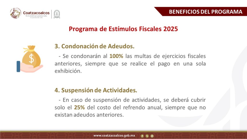 El director de Ingresos de Coatzacoalcos, Sidronio Alfaro Jiménez, informó que el programa estará vigente del 17 de febrero al 31 de mayo de 2025, por lo que exhortó a los comerciantes a consultar las bases y requisitos.