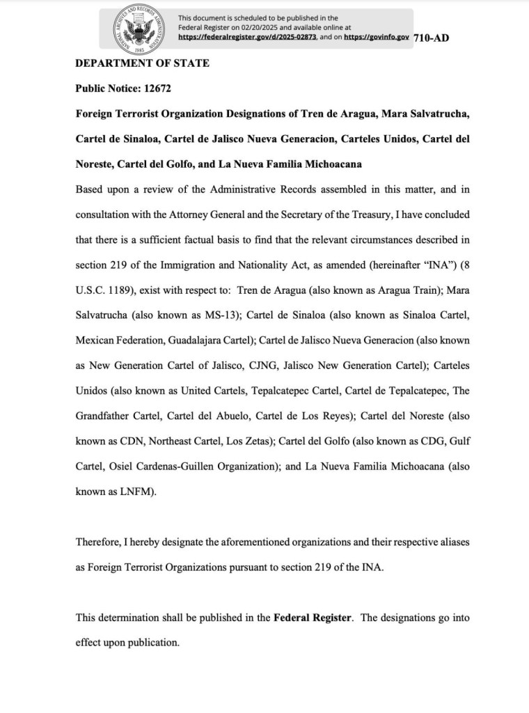 La decisión de Rubio cumple con la orden ejecutiva que firmó el presidente de Estados Unidos, Donald Trump, en el primer día de su mandato, cuando ordenó declarar a los carteles del narcotráfico como grupos terroristas.