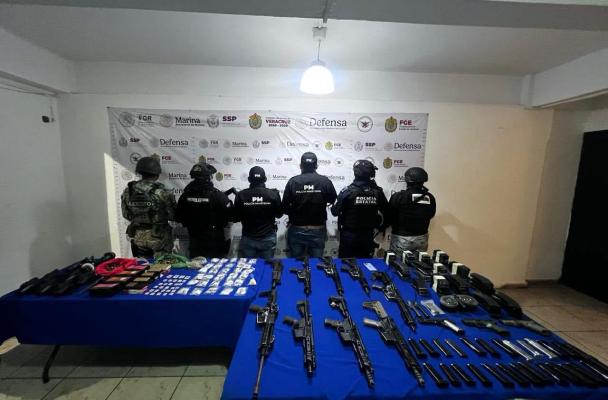 En el lugar se logró el aseguramiento de 622 bolsas herméticas que contenían polvo blanco granulado con características similares a las del cristal y 178 bolsas con una sustancia con características similares a las de la cocaína, 1,310 cartuchos útiles de diversos calibres, así como cargadores balísticos, granadas de mano defensivas de fragmentación, armas de fuego cortas y largas, holsters para arma corta, cerrojos de arma larga, baterías, una carcasa de cámara de grabación y accesorios, diversas tarjetas bancarias, credenciales de elector y un teléfono celular.