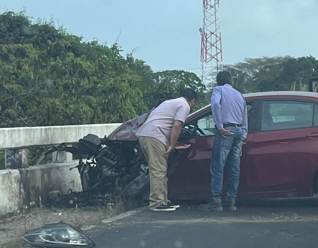 El vehículo involucrado es un Chevrolet Cavalier de color rojo y modelo reciente, cuyo conductor resultó gravemente herido tras impactarse de frente contra un pesado tractocamión. El choque ocurrió específicamente en el puente “Dos Arroyos”, donde el vehículo particular quedó destrozado contra el muro divisor.