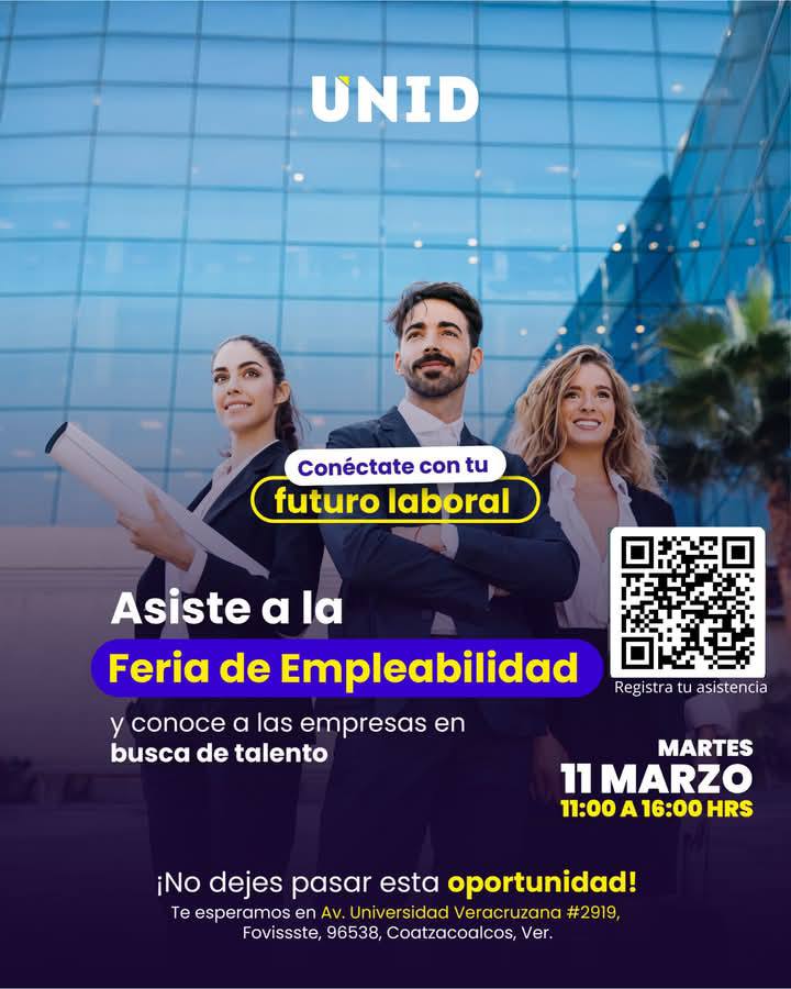 Con el objetivo de impulsar la reactivación económica y brindar oportunidades laborales a la comunidad, la Universidad Interamericana para el Desarrollo (UNID) campus Coatzacoalcos, anuncia la celebración de su primera Feria de Empleabilidad, este martes 11 de marzo.