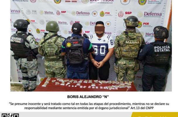 En en lugar, se logró la detención en flagrancia de Boris Alejandro “N” y el aseguramiento de hierba verde seca con características similares a las de la marihuana y bolsas herméticas que contenían polvo blanco, así como una pipa para el probable consumo de droga.