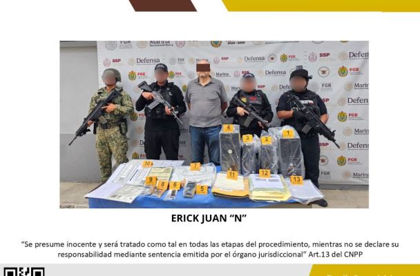 En el lugar se logró la detención en flagrancia de Erick Juan “N”, así como el aseguramiento de múltiples documentos oficiales y de identificación personal probablemente apócrifos, papel presumiblemente para uso de documentos oficiales con logos de diferentes instituciones.