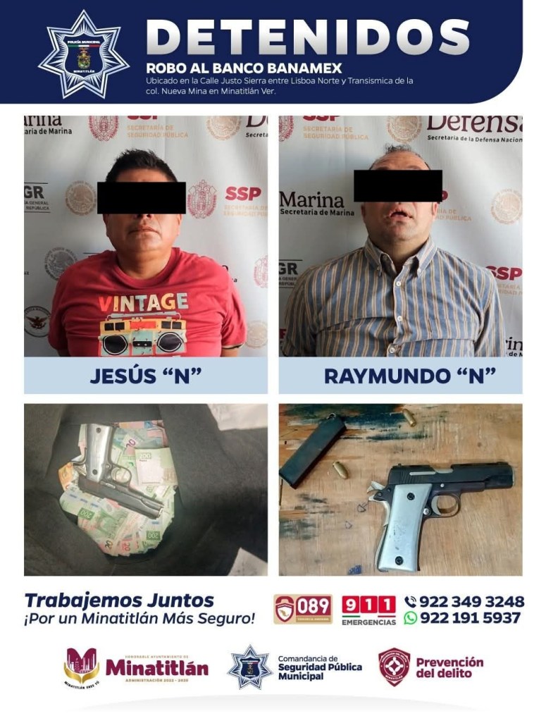 Elementos de la Policía Municipal de Minatitlán acudieron rápidamente al lugar de los hechos y pusieron en marcha un operativo de persecución, logrando la detención de dos sujetos masculinos, identificados como Jesús «N», de 37 años y originario de Salina Cruz, Oaxaca, y Raymundo «N», también de 37 años y originario de Minatitlán. Durante la detención, se aseguraron armas de fuego.