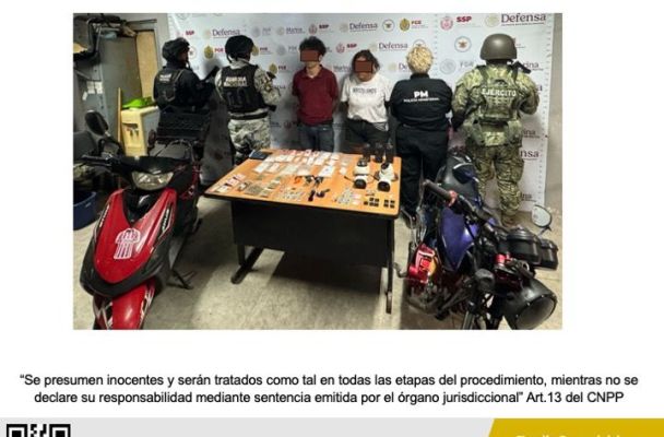 En el lugar, se logró la detención en flagrancia de José Antonio “N”, Freddy “N” y Ana Cecilia “N”, así como el aseguramiento de hierba verde seca con características similares a las de la marihuana, polvo blanco, una sustancia cristalina, bolsas transparentes, dinero en efectivo, radios de comunicación, una báscula digital, pipas de cristal, cámaras de videograbación y motocicletas.