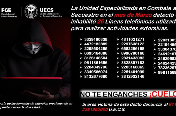 La Unidad Especializada en Combate al Secuestro a través del Departamento de Negociación, logró desactivar 12 engaños telefónicos ocurridos durante el mes de marzo del 2025 en todo el estado de Veracruz, así como la inhabilitación de 26 líneas telefónicas, las cuales eran ocupadas por los extorsionadores para realizar los engaños telefónicos.