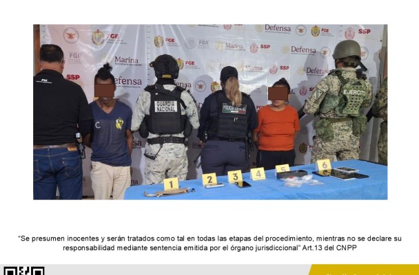En el lugar se logró la detención en flagrancia de Miguel de Jesús “N” y Tania Tabita “N”, así como el aseguramiento de una sustancia granulada con características similares a las de la droga conocida como cristal, una pipa, una báscula gramera, celulares, bolsas tipo ziploc y hojas con anotaciones consistentes en nombres, recopilación de cantidades y gramajes.