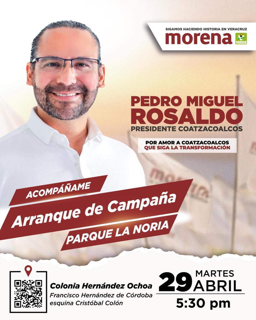 Coatzacoalcos, Veracruz, – Pedro Miguel Rosaldo García, candidato del partido Morena a la alcaldía de Coatzacoalcos, dará inicio a su campaña política este martes en el Parque La Noria, ubicado en la colonia Hernández Ochoa, específicamente en la intersección de la calle Francisco Hernández de Córdoba y Cristóbal Colón, a las 17:30 horas.