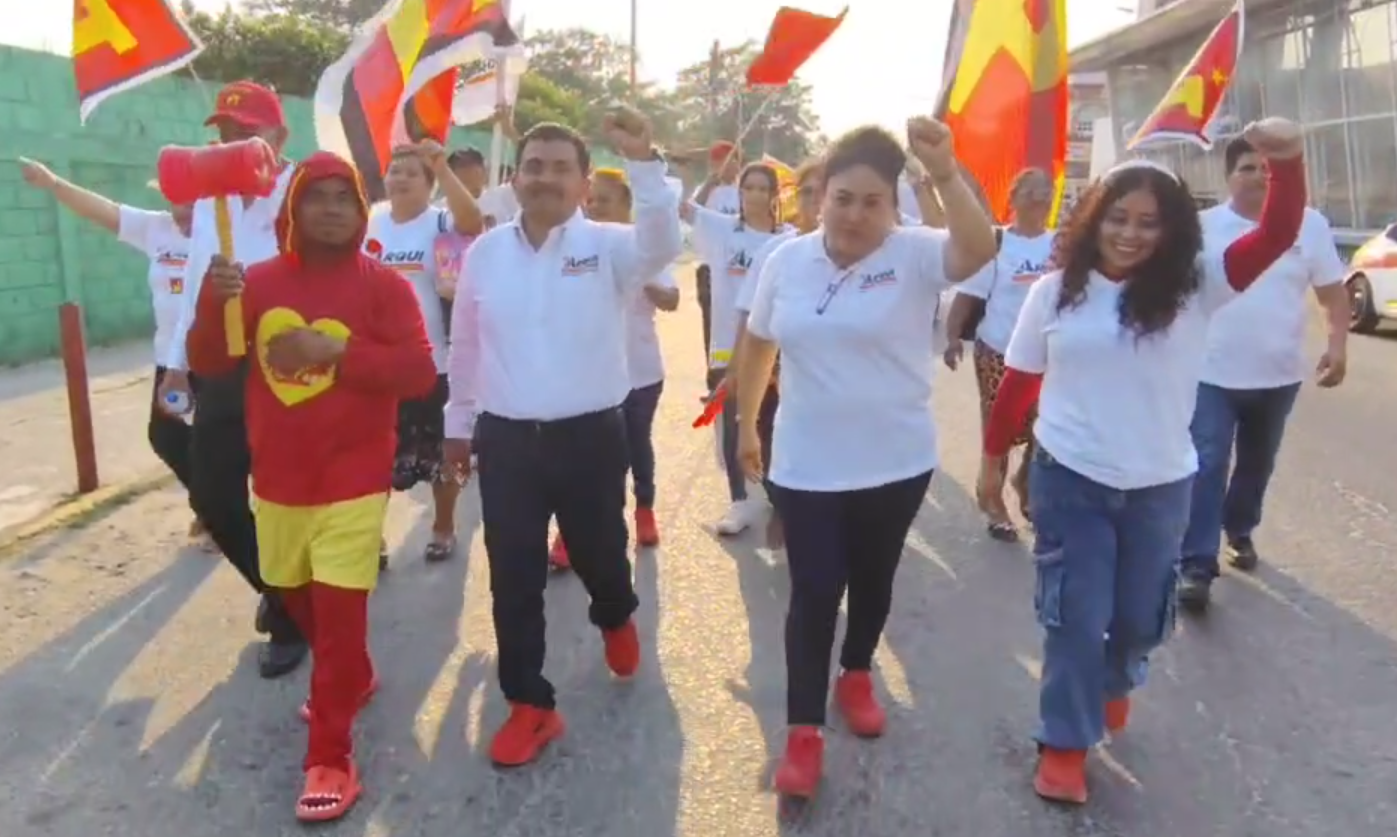 Posteriormente, el candidato se trasladó al Mercado Juárez, donde continuó su recorrido proselitista. El contingente, identificado por los colores rojo, blanco y amarillo, ondeaba banderas y distribuía artículos propagandísticos, como gorras, playeras y bolsas, creando un ambiente festivo.
