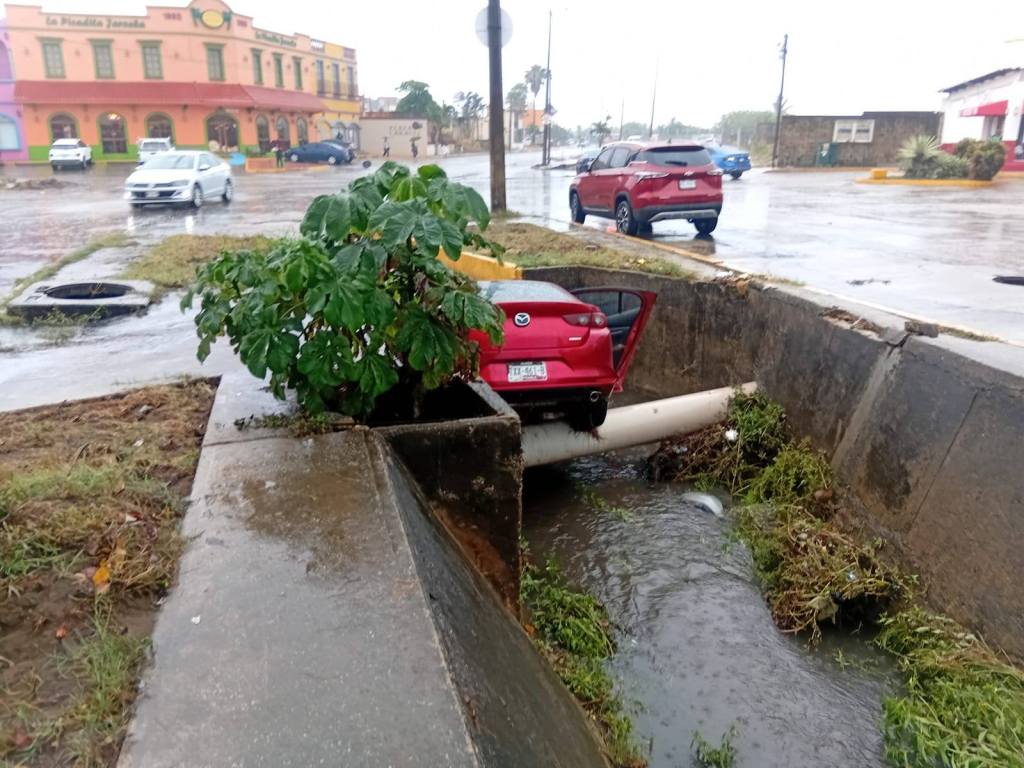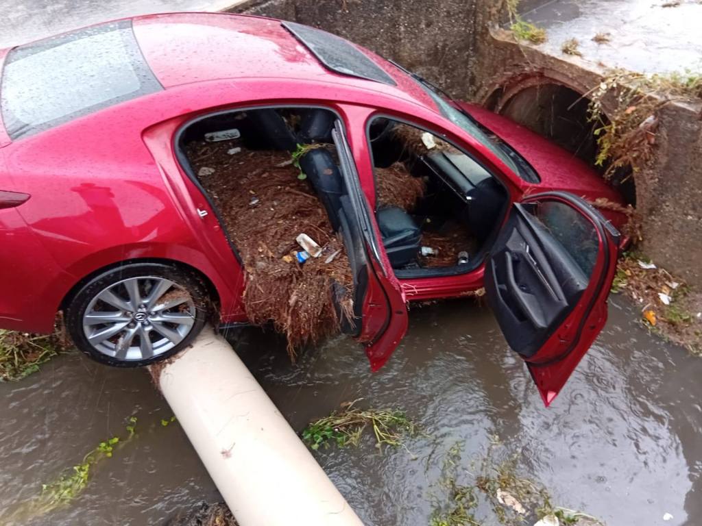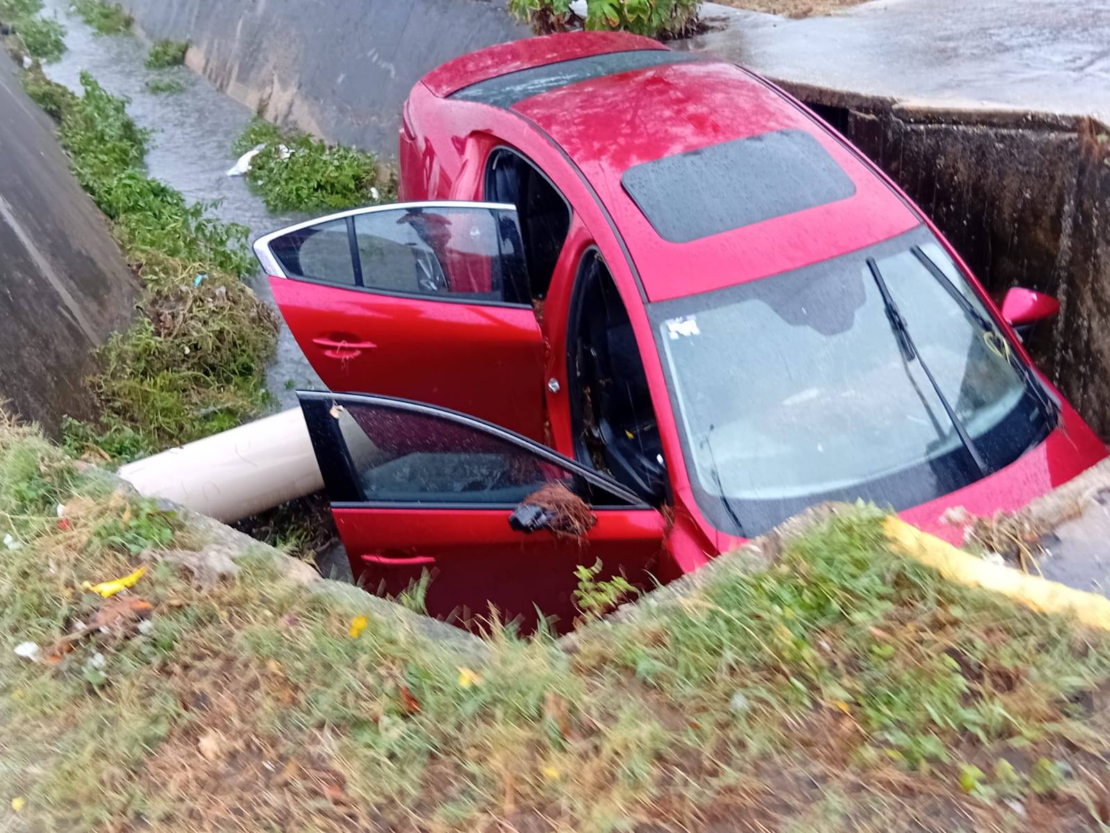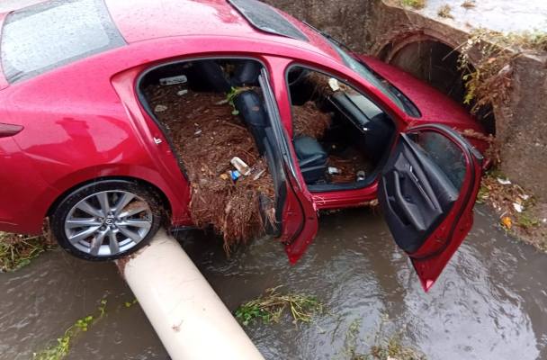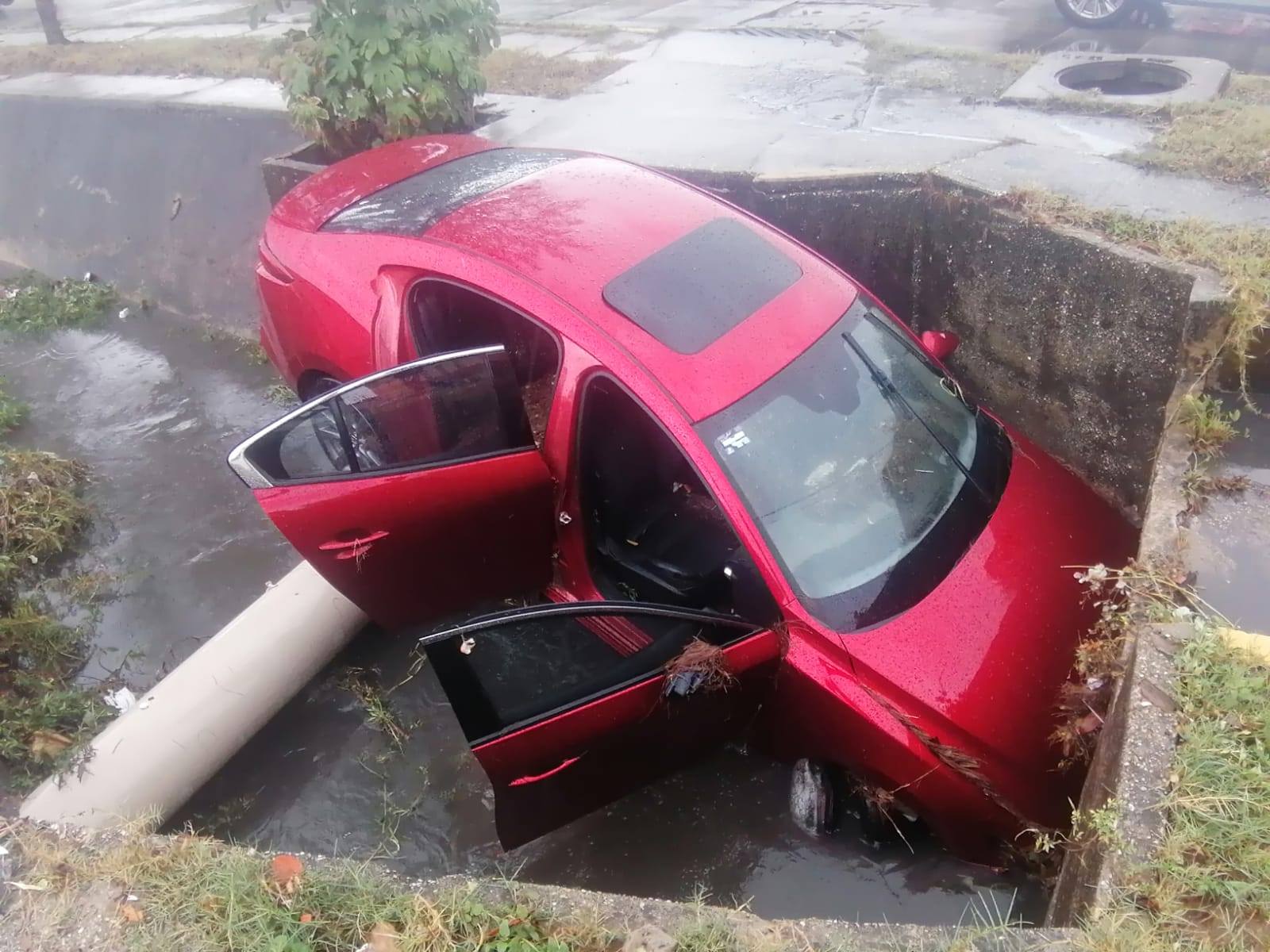 La fuerte lluvia que azotaba la ciudad en el momento del percance pudo haber contribuido a la pérdida de control del automóvil. El impacto contra el fondo del canal provocó severos daños en la parte frontal del Mazda, dejando el cofre prácticamente inservible.